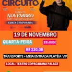 Valor: R$ 230,00 (meia-entrada plateia VIP + transporte porta a porta; consulte seu bairro)
