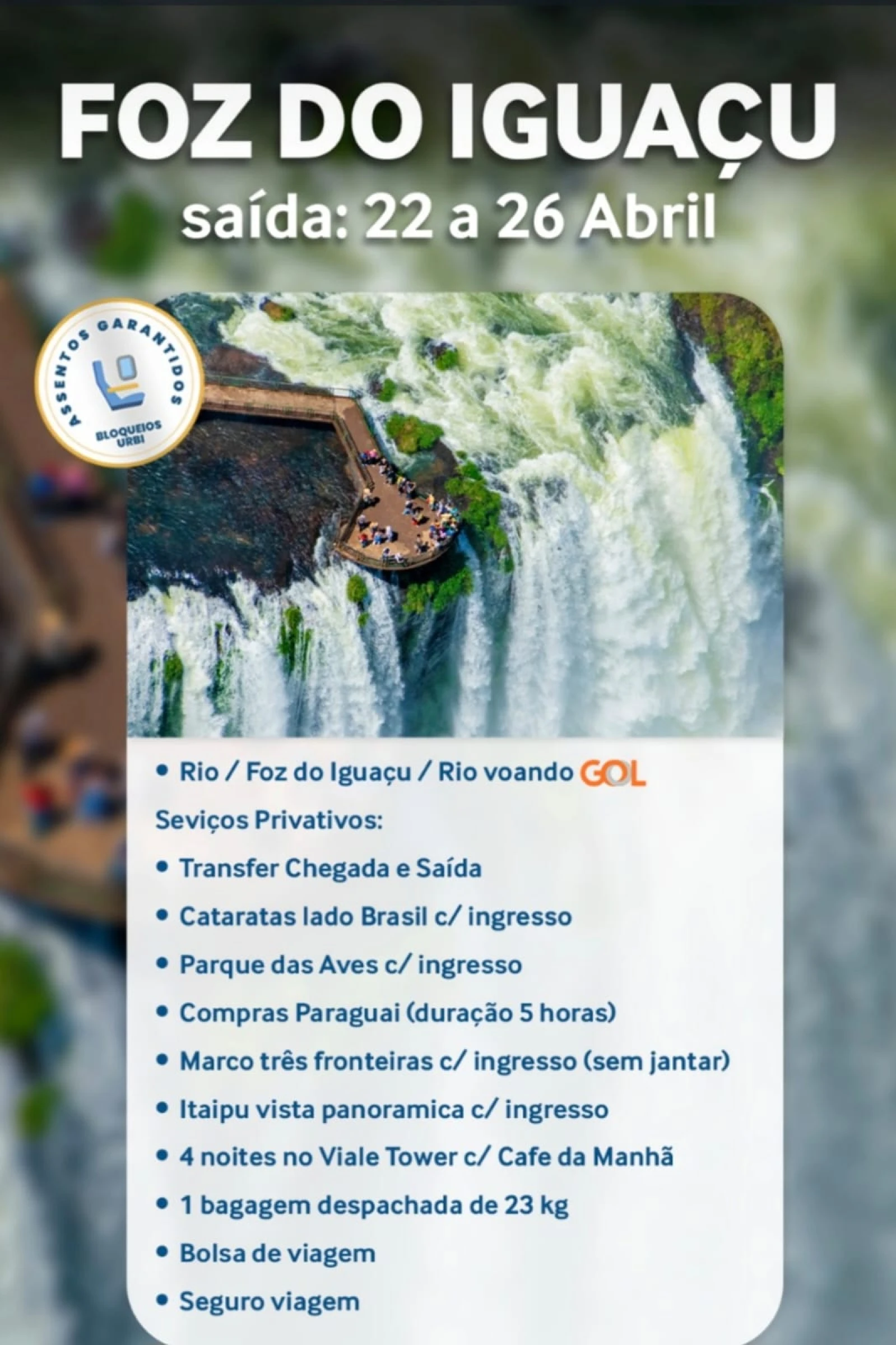 Inclui: Passagem aérea, voando com a Cia GOL, com direito a uma bagagem despachada de 23 quilos + uma bagagem de mão de 10 quilos;